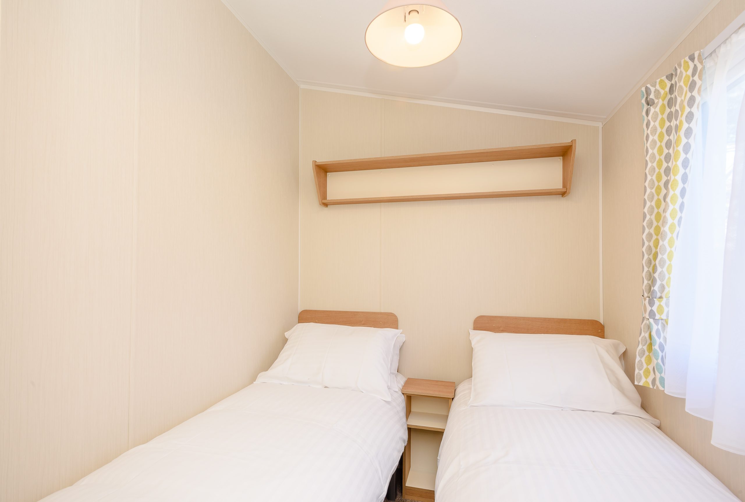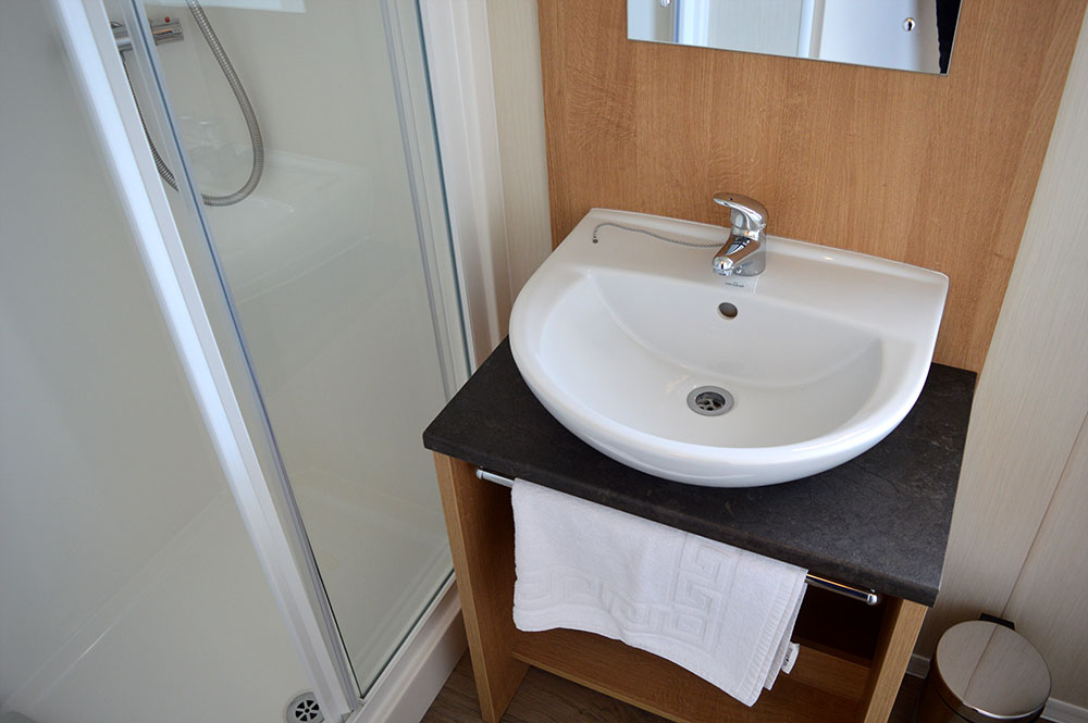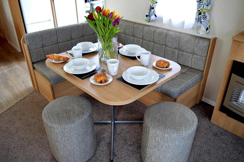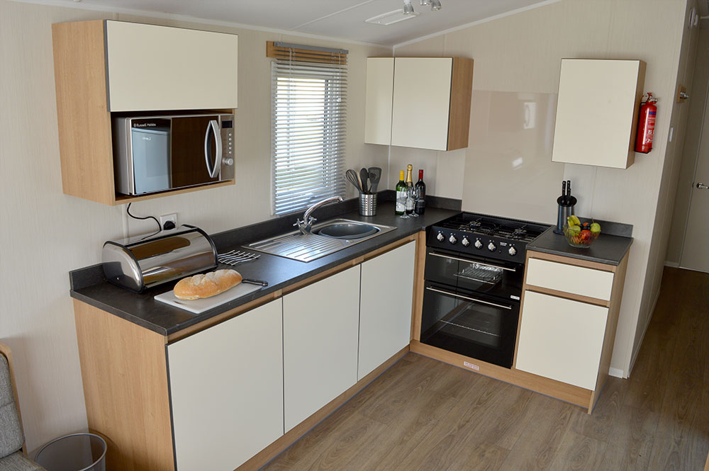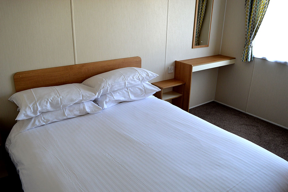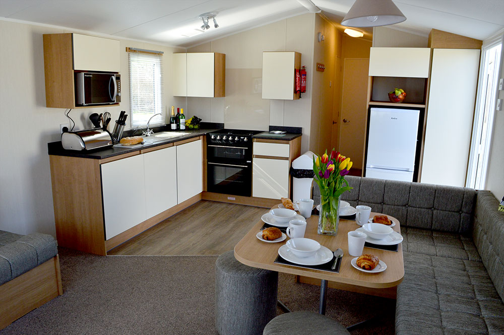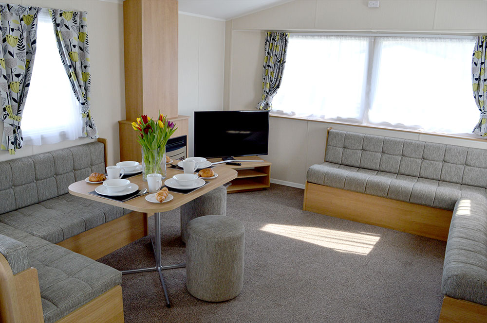 These 12-ft-wide 3 Bedroom Caravans are designed for larger groups. They have a double bedroom, two twin bedrooms and a pull-out sofa bed in the lounge. There’s an open-plan lounge, kitchen and diner, with wrap-around seating area and kitchen appliances.